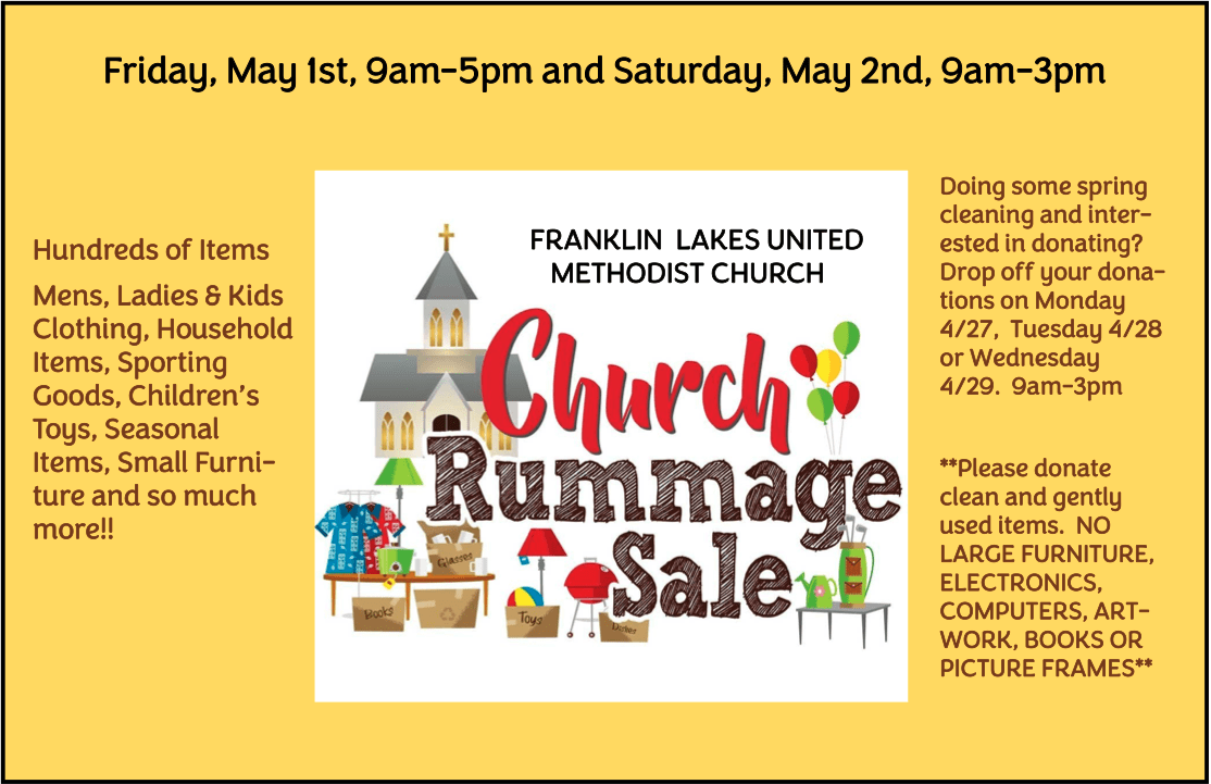 SPRING RUMMAGE SALE ~ Be sure to save the dates for our Spring Rummage Sale to take place on Friday, May 1 (9:00am–5:00pm) and Saturday, May 2(9:00am–3:00pm).